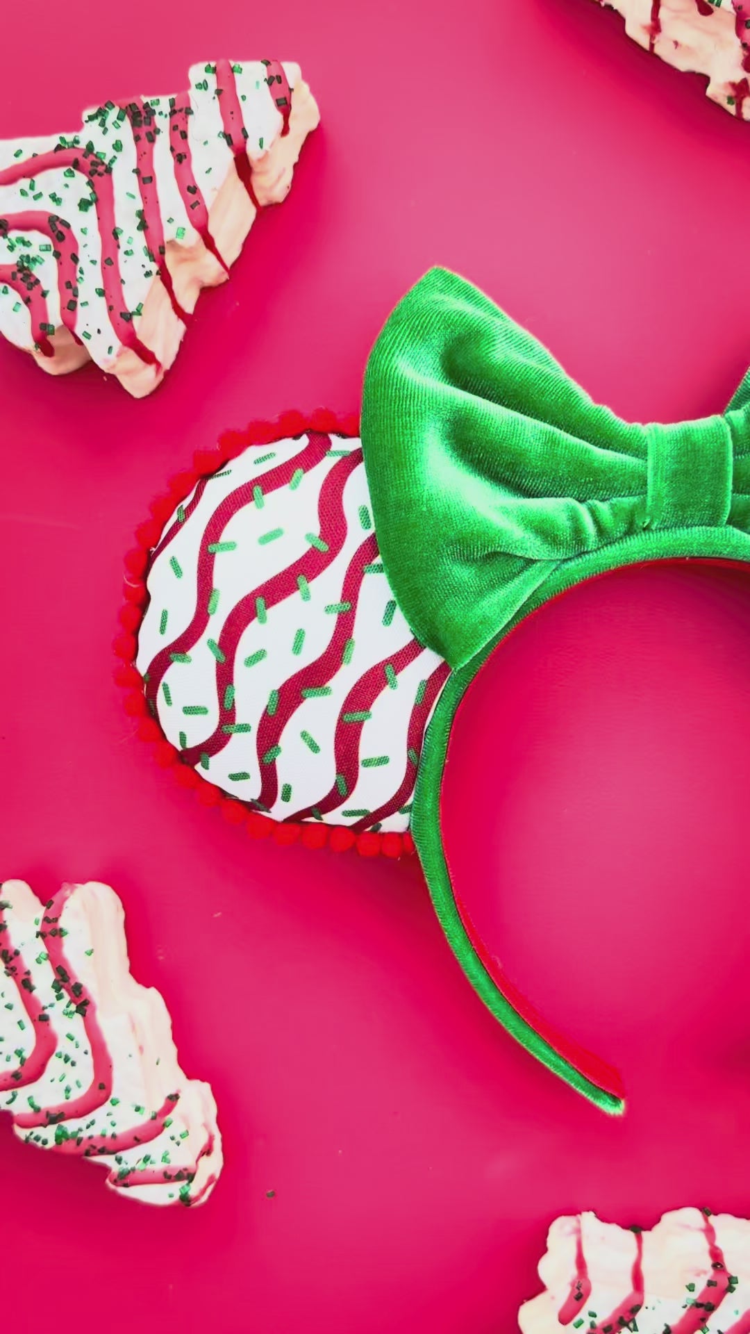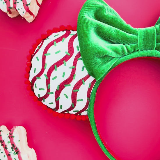 These handcrafted Minnie Mouse ears are inspired by everyone's favorite Christmas Tree Cake treat, bringing a deliciously festive look to your holiday season and park visits.