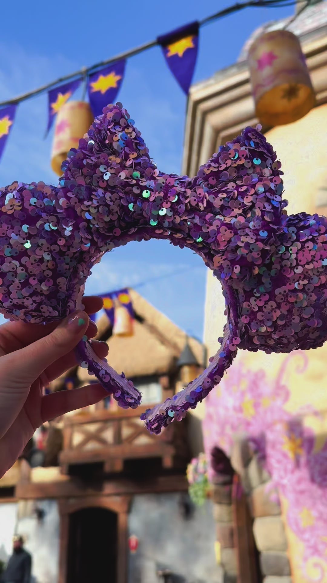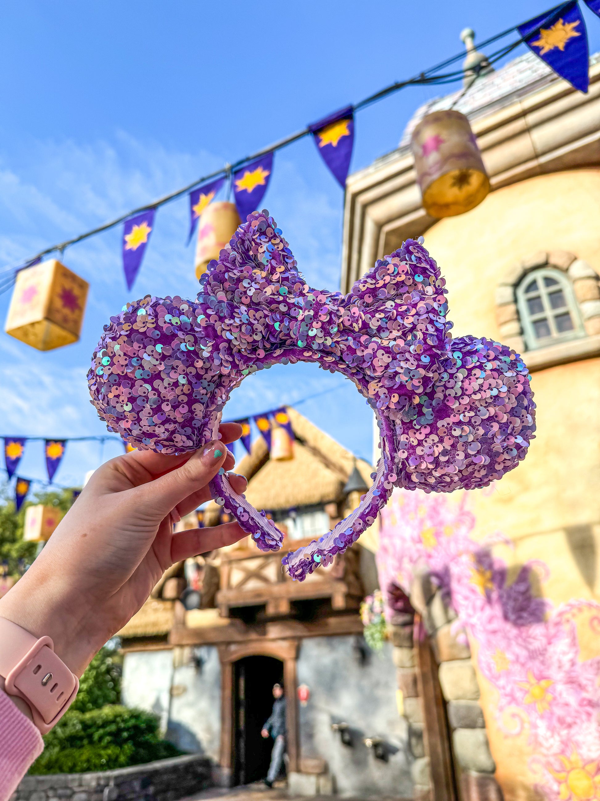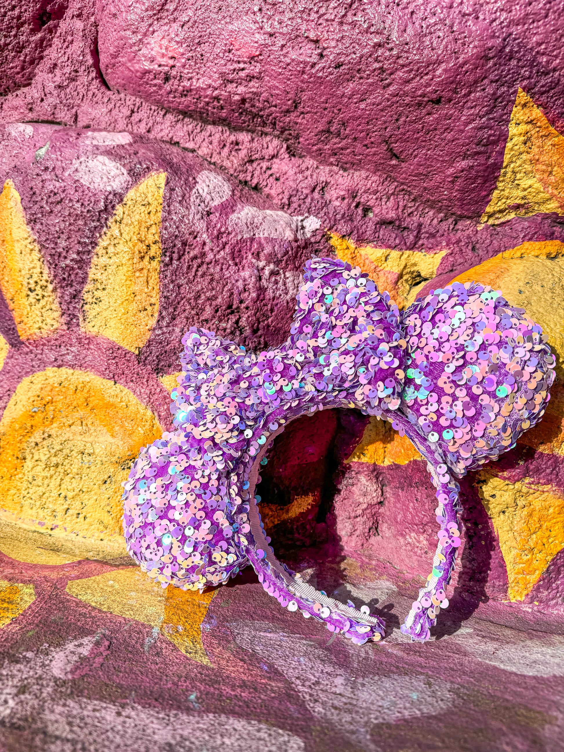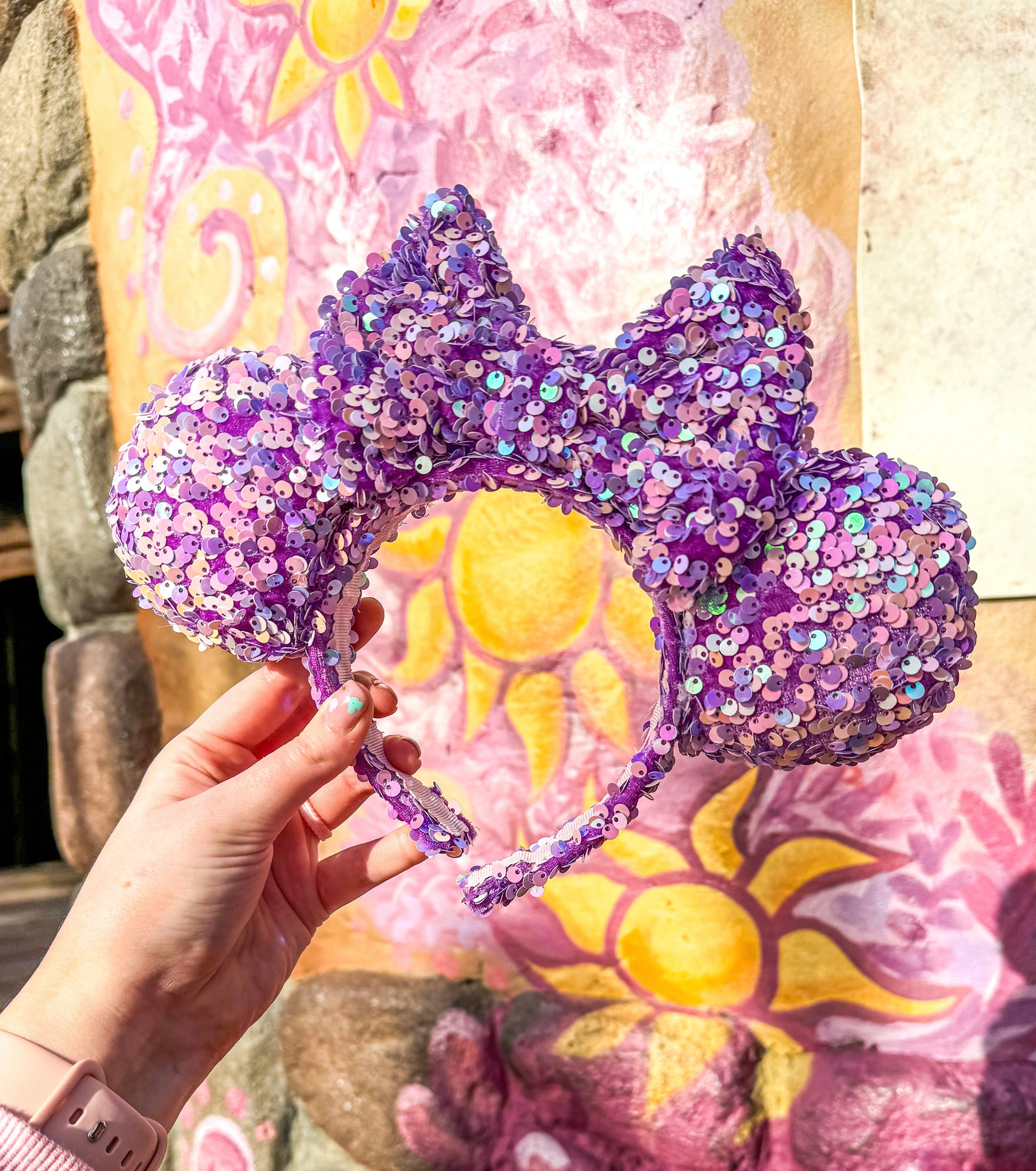 These Purple and Pink Sequin Minnie Ears are the perfect way to add a touch of sparkle to your outfit.