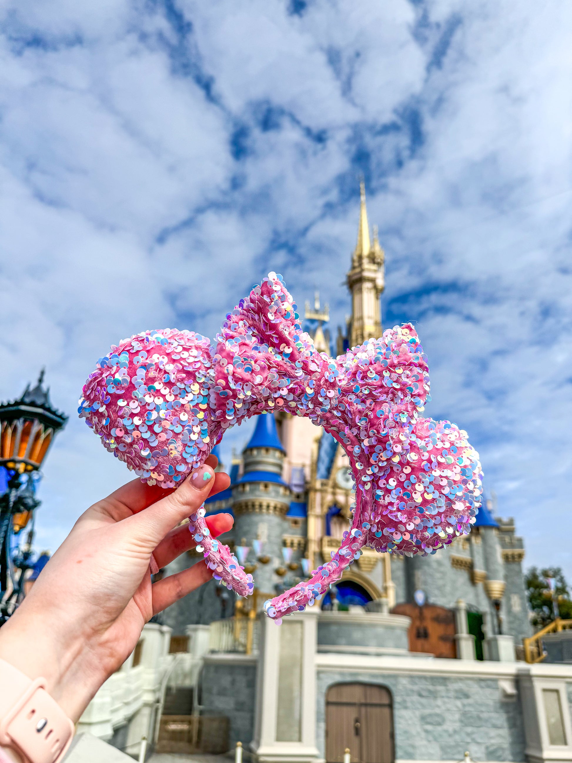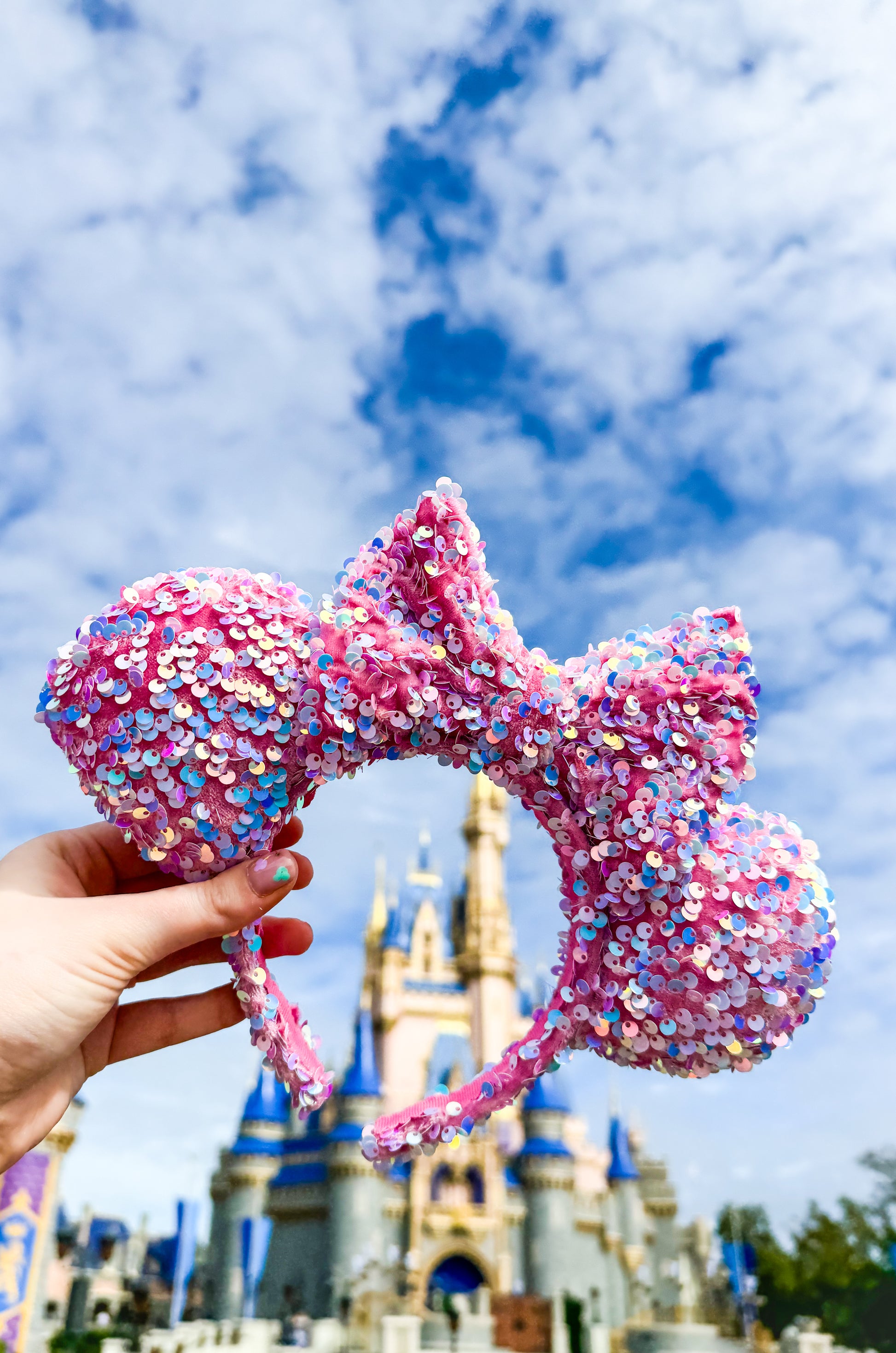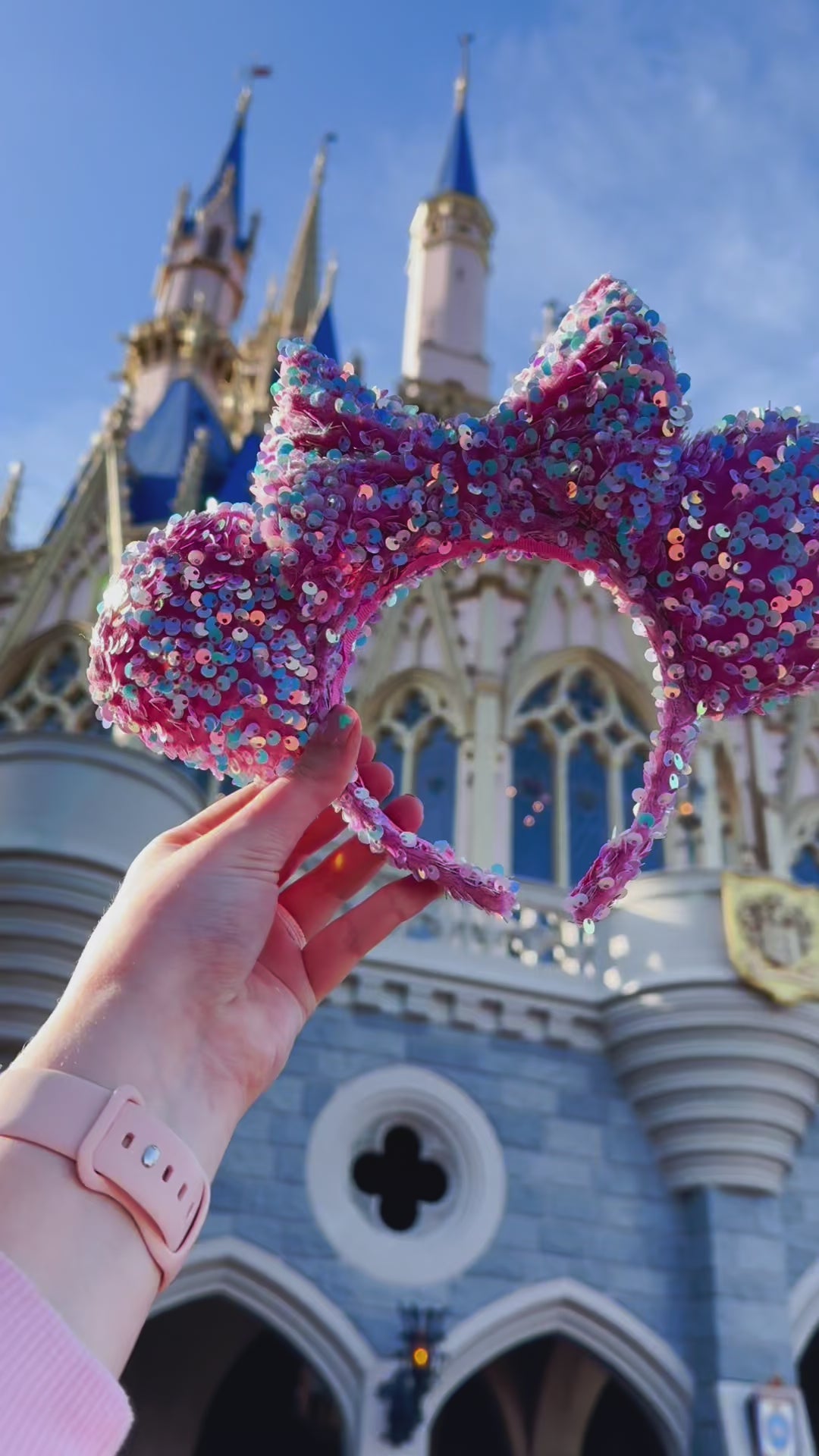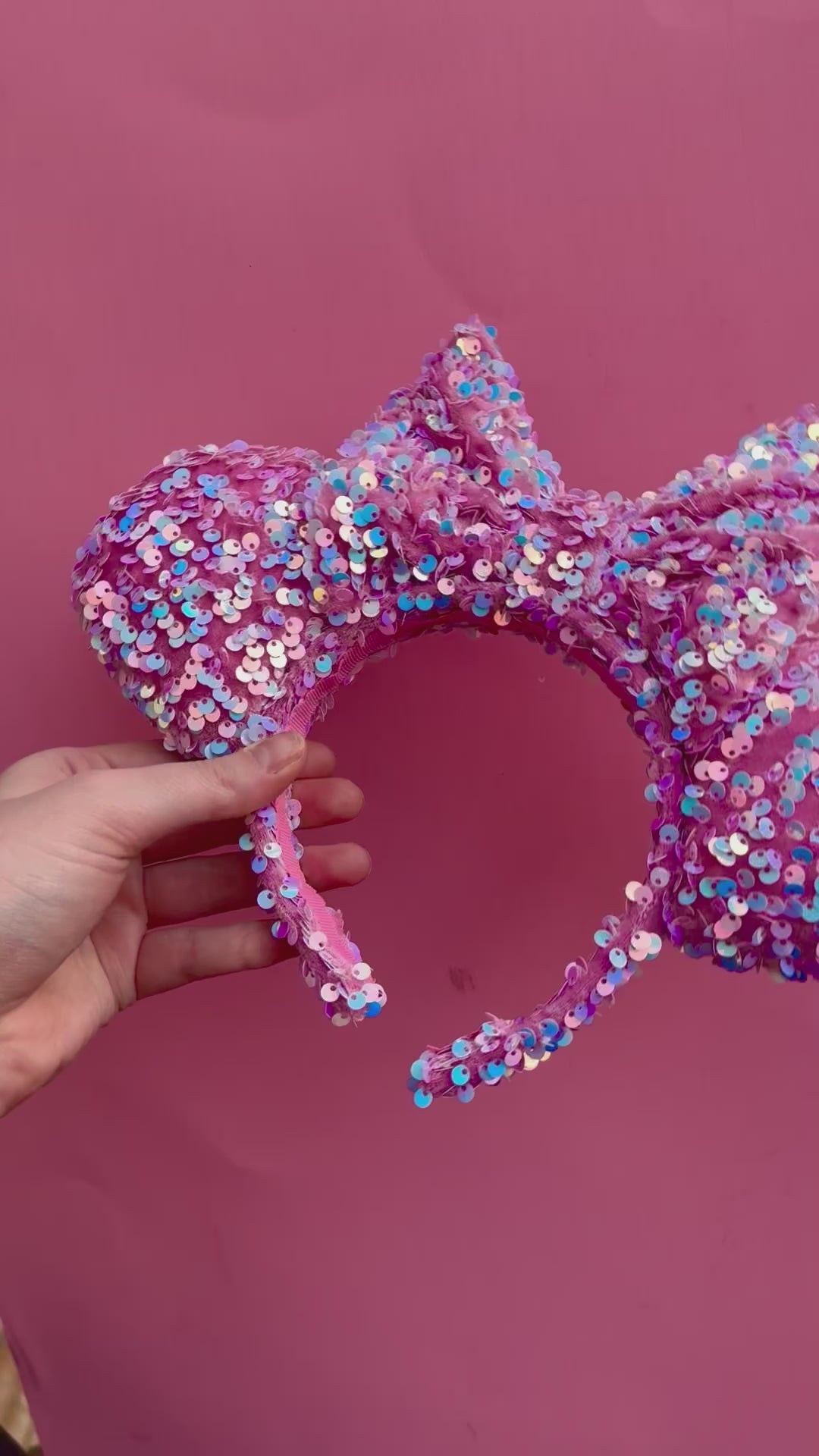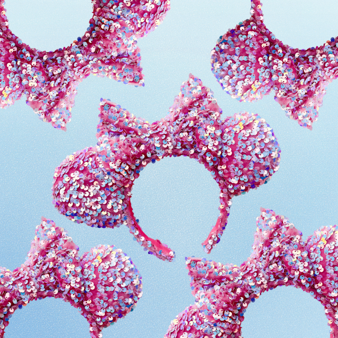 These Pink Sequin Minnie Ears are the perfect way to add a touch of sparkle to your outfit.