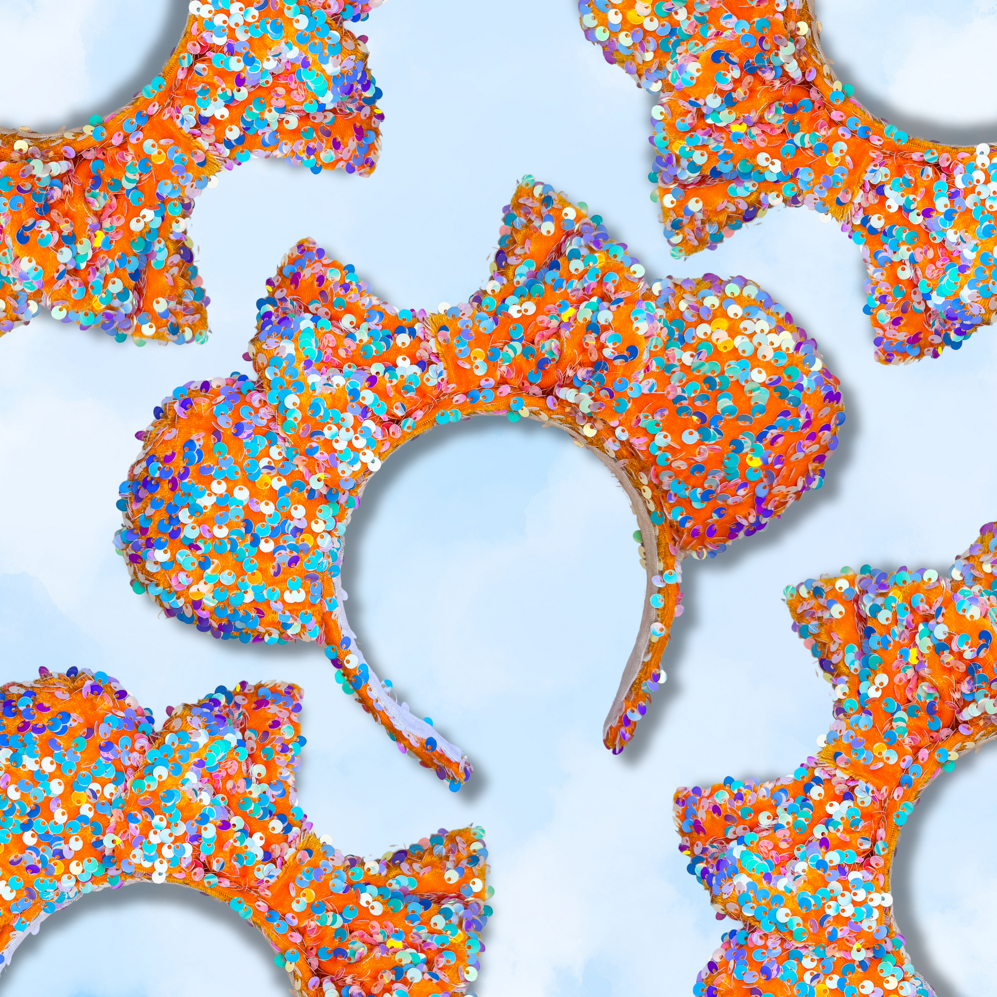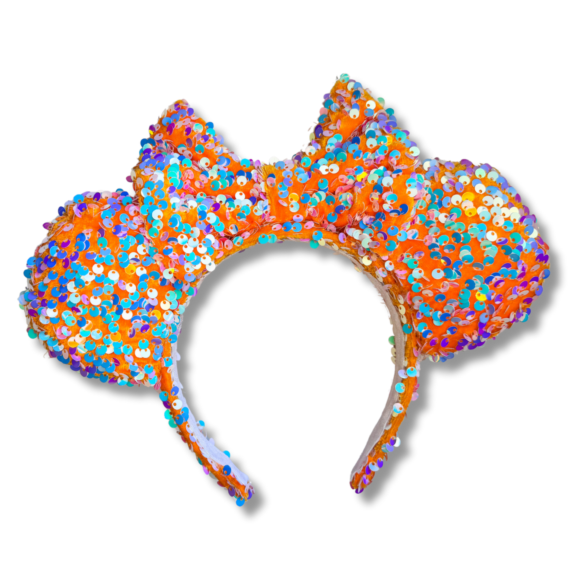 These Orange and Blue Sequin Minnie Ears are the perfect way to add a touch of sparkle to your outfit.