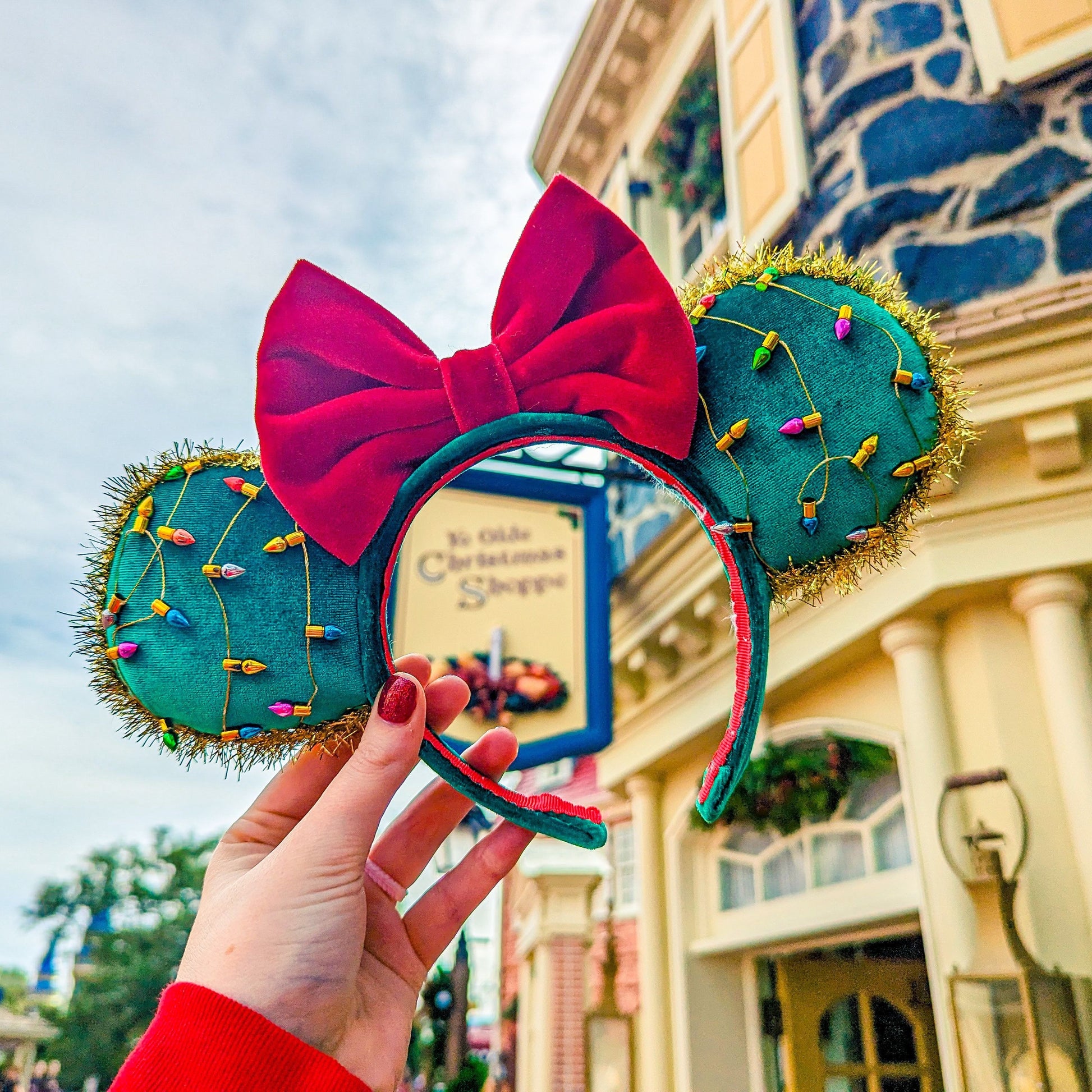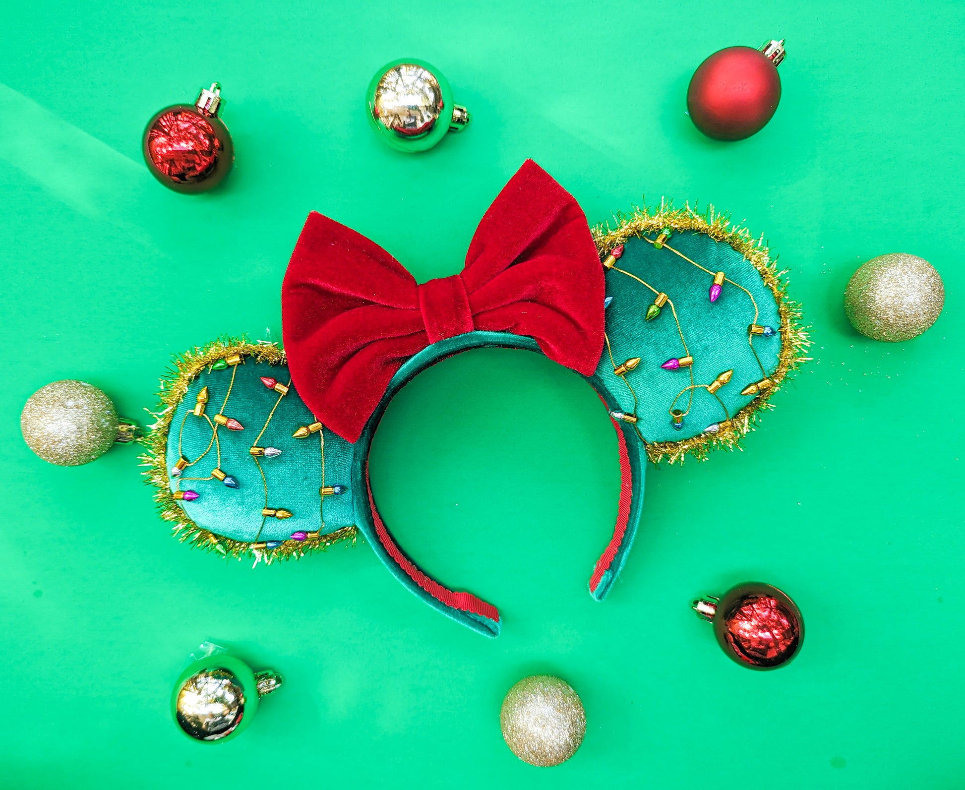 Get ready to light up your holidays with our enchanting "Tis the Season" Minnie Ears! These festive Minnie Mouse ears feature a rich green velvety fabric adorned with whimsical Christmas lights and a luxurious red velvet bow. Perfect for your next Disney holiday trip, Christmas parties, or simply bringing festive cheer to any outfit. Celebrate the most wonderful time of the year in true Disney style!